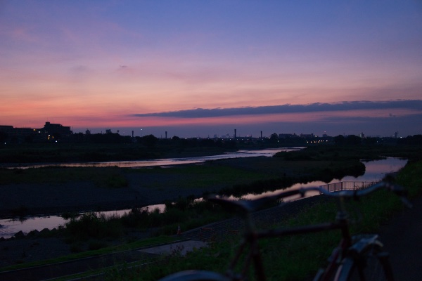多摩川を下ります。朝焼けと、二子玉川のご来光が綺麗。