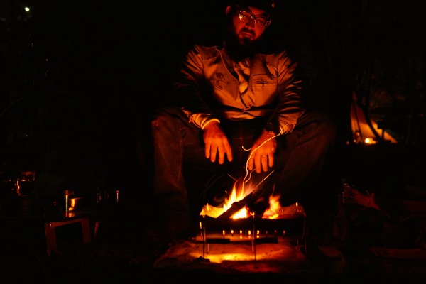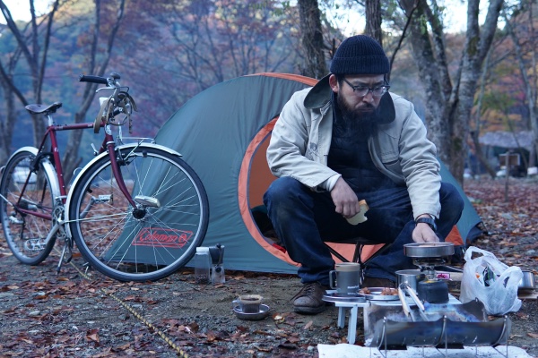 髭のおっさんが、テントを設営してコーヒー飲んで、肉食べて、薪を焚べてます。